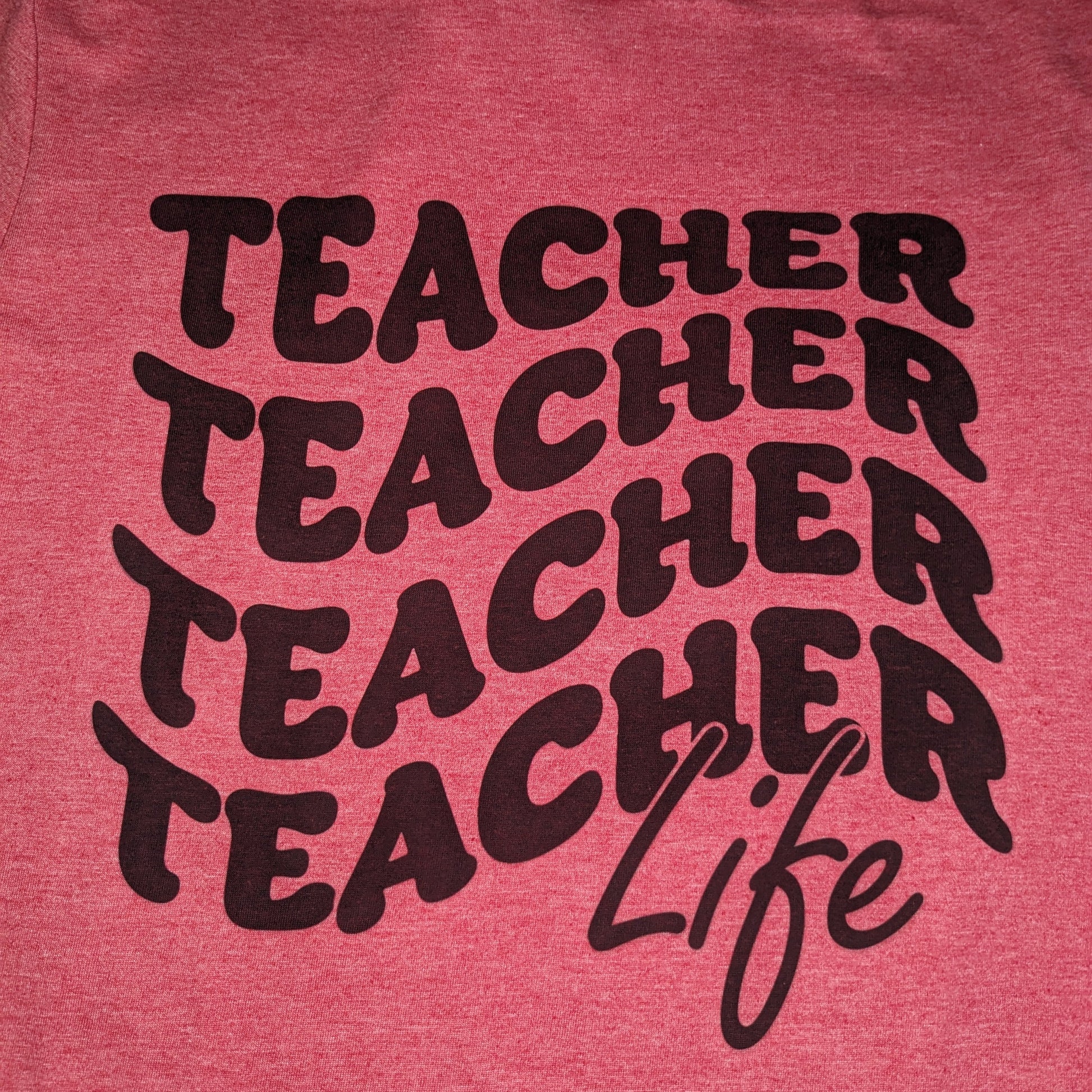 The "Teacher Life" design features a vibrant sublimation print on a Gildan Softstyle Heather Red Poly/Cotton blend shirt. This combination provides a soft, breathable fabric that balances comfort and durability, ideal for educators who want to showcase their dedication with a comfortable, long-lasting garment.