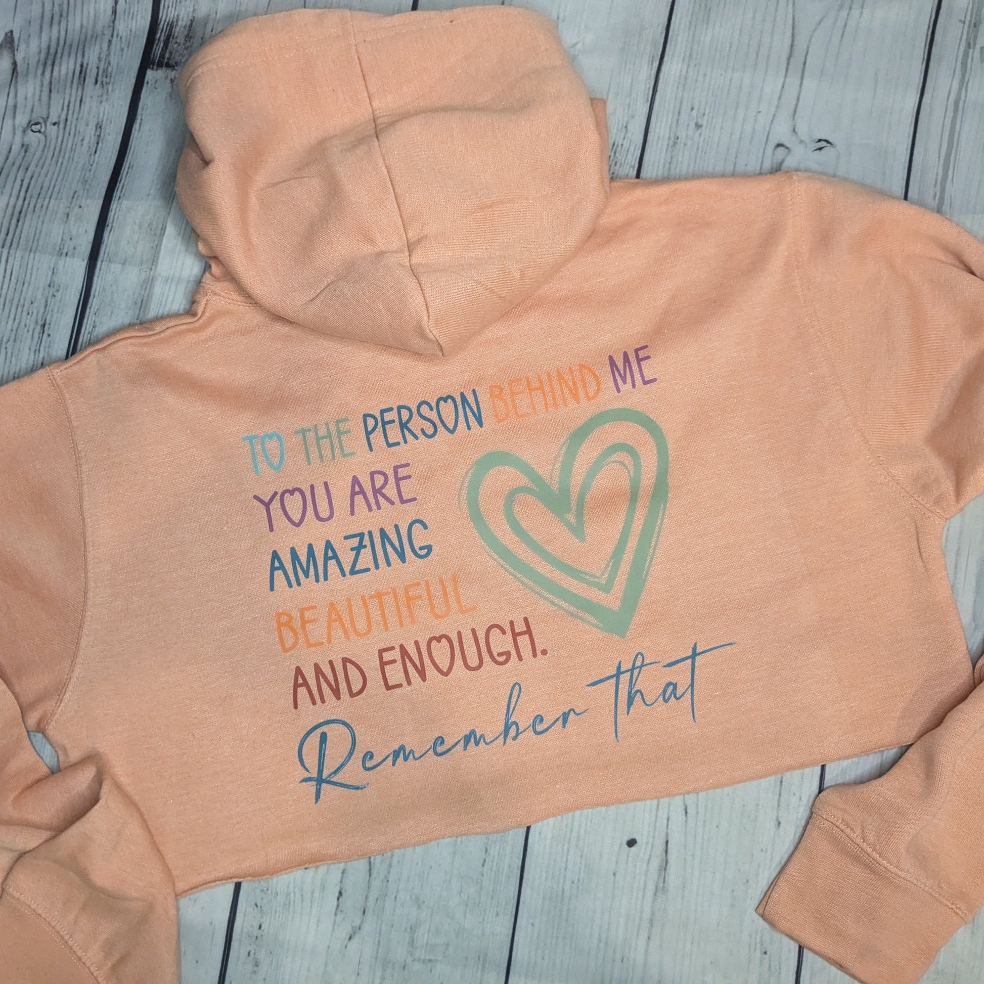 Celebrate kindness and mental wellness with the "To the Person Behind Me Cropped Hoodie" in a soft peach tone. This stylish cropped hoodie offers both comfort and a powerful reminder that everyone is amazing, beautiful, and enough. Perfect for spreading positivity wherever you go, it combines a modern fit with a meaningful message to support mental health awareness. Stay cozy while inspiring others to embrace self-worth and kindness daily.